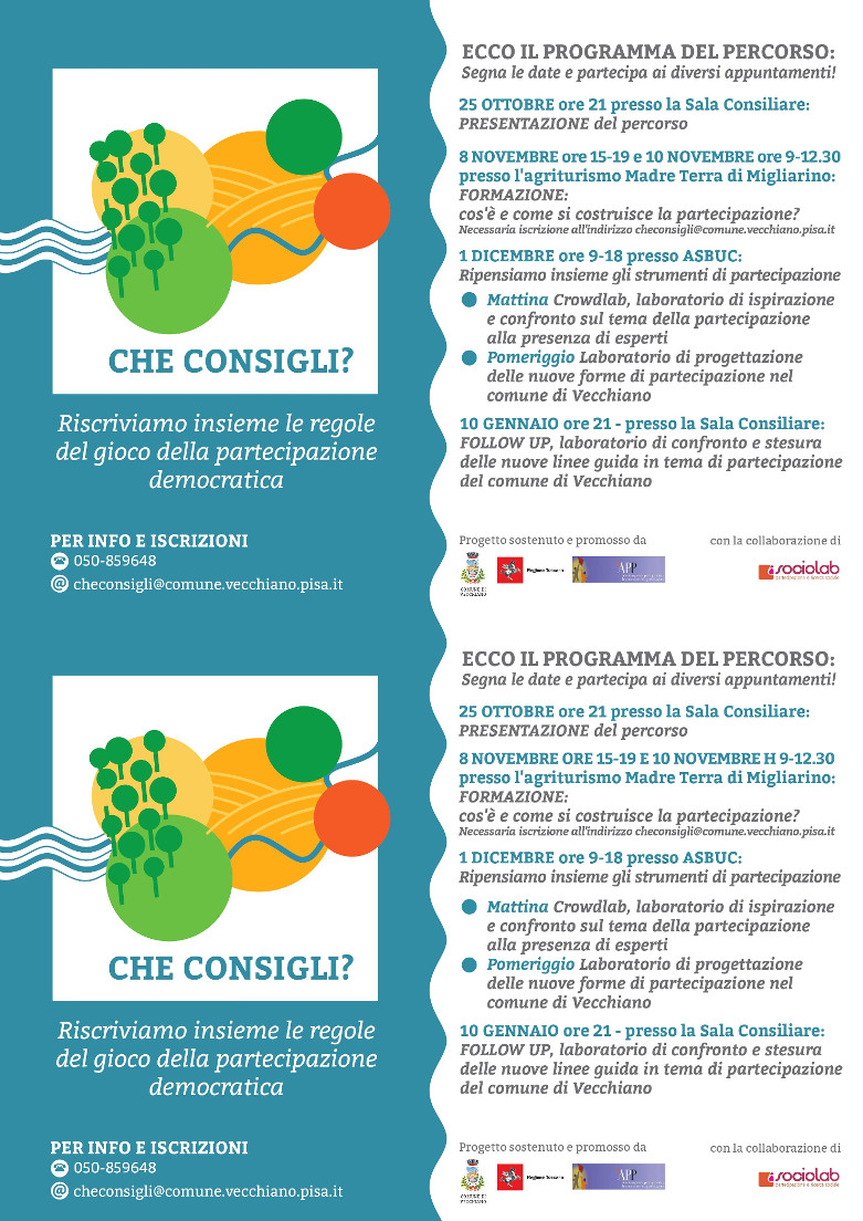 - Pomeriggio: Laboratorio di progettazione delle nuove forme di partecipazione nel Comune di Vecchiano