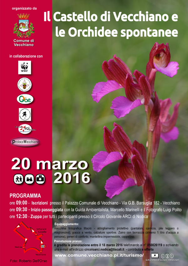 Vecchiano – Domenica 20 marzo si svolgerà la prima manifestazione di aspettando la Fiera di Primavera 2016 dal titolo “Il Castello di Vecchiano e le Orchidee spontanee: passeggiata culturale gastronomica dalle colline al Serchio”. L’iniziativa è inserita nel calendario annuale delle manifestazioni della rete dei Comuni del Monte Pisano ed è organizzata dal Comune in collaborazione con WWF Gruppo Archeologico Vecchianese, Circolo Giovanile ARCI di Nodica, Pro-Loco di Vecchiano, Assessorato all’Ambiente. Una piacevole passeggiata per tutti sulla collina di Vecchiano, ultima propaggine nord del Monte Pisano, caratterizzata da una importante fioritura di orchidee spontanee. L’appuntamento è alle ore 9.00 in piazza Garibaldi a Vecchiano, dove, Marcello Marinelli, (Guida Ambientale Escursionistica e Presidente Associazione WWF Alta Toscana Onlus, ndr), Ilaria Amore del Gruppo Italiano Ricerca Orchidee Spontanee GIROS, Roberto Dell’Orso del CAI e la Pro Loco di Vecchiano, vi aspettano per salire verso il castello di S. Maria, presso il quale il Gruppo Archeologico Vecchianese accoglierà i partecipanti, dando spiegazioni delle caratteristiche storico culturali dei luoghi.