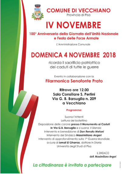 Il Comune di Vecchiano, con la collaborazione della Filarmonica Senofonte Prato, invita la Cittadinanza alla commemorazione della Giornata del 4 novembre, che quest’anno celebra il 100enario della fine della 1° Guerra Mondiale